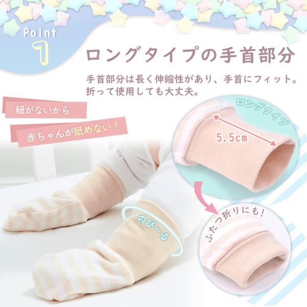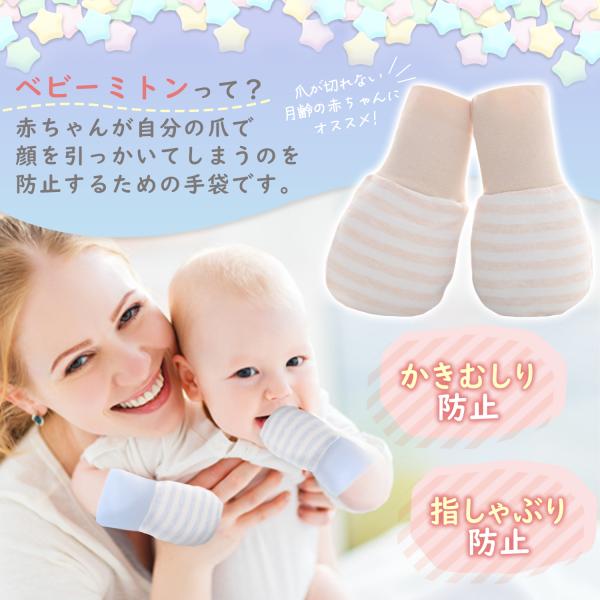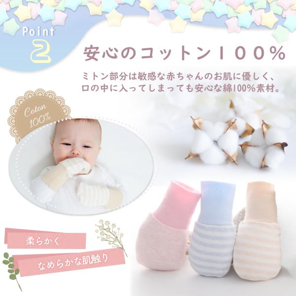 かきむしり防止、指しゃぶり防止に役立ちます。爪がまだ切れない月齢の赤ちゃんにおすすめです。