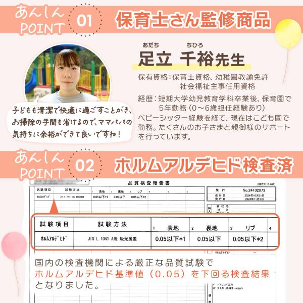 ウエスト部分には、約6センチと幅広の収縮素材を採用。おねしょ対策をしながら、お腹の冷えを防いで寝冷えからもお子様を守ります。