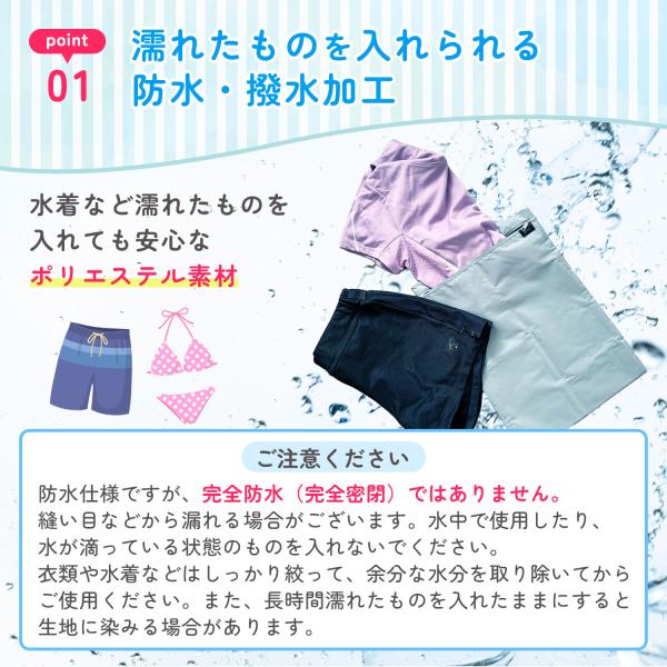 防水ポリエステル素材で水着など濡れたものを入れて大丈夫。お子様の汚れた衣類の収納にもオススメです。