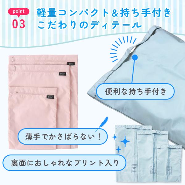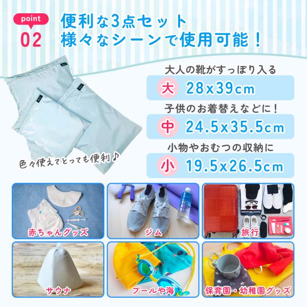大・中・小の3サイズセットなので、赤ちゃんグッズ・ジム用品・旅行のパッキング・サウナグッズ・プールや海・保育園や幼稚園グッズの収納など様々な用途でご使用いただけます。