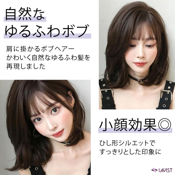 肩に掛かるボブヘアーのウィッグです。かわいらしい自然なゆるふわ髪を再現することができます。小顔効果抜群のボブはひし形シルエットですっきりとした印象に。ナチュラルなヘアスタイルなので、様々なファッションに合わせやすいウィッグです。