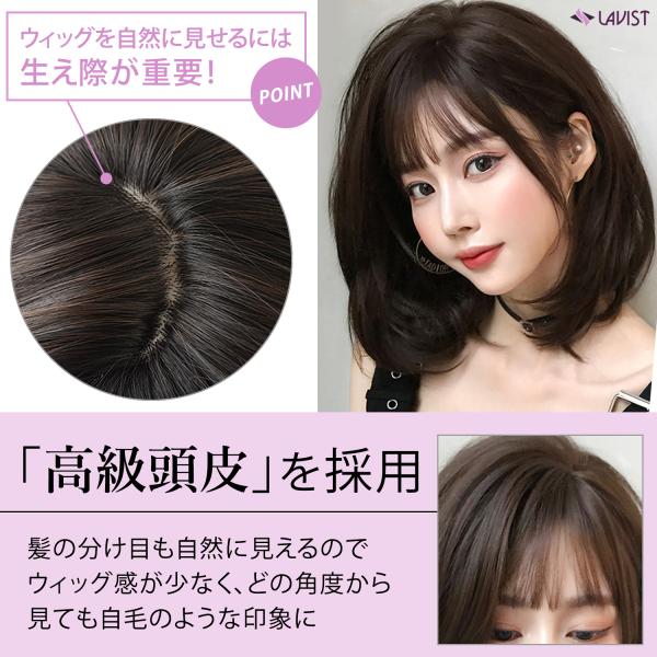 ウィッグを自然に見せるには生え際が重要なポイント。髪の生え際も自然に見える高級頭皮を使用しています。髪の分け目も自然に見えるのでウィッグ感が少なく、どの角度から見てもまるで自毛のような印象に仕上げました。