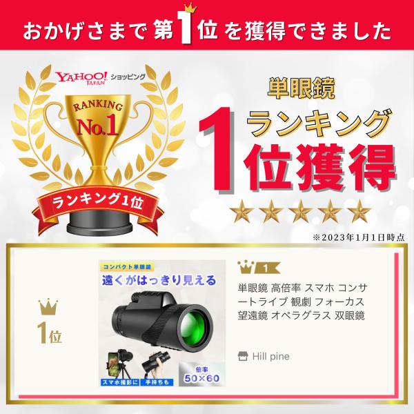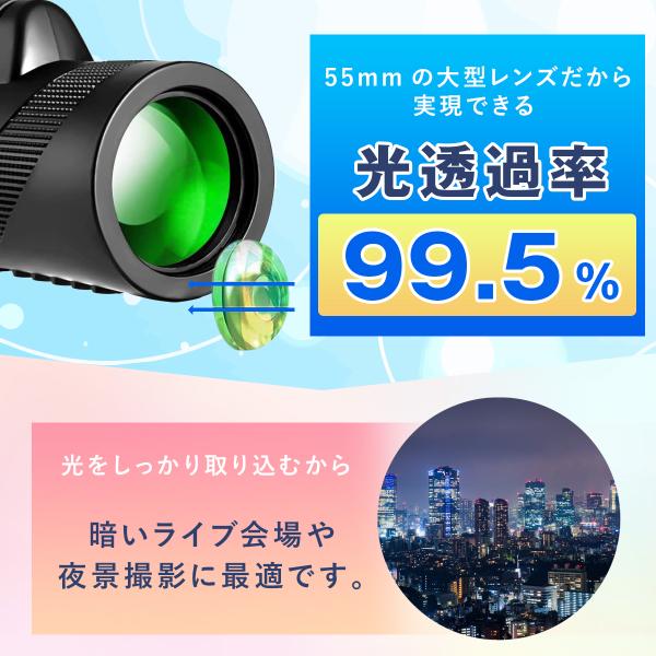 【高倍率レンズ】単眼鏡レンズは広視野を備え、鮮明でくっきりした視界を楽しめます。また光学多層?膜コーティン(FMC)が施されており、高い光通過率と明るさでコンサートなどの薄暗めの会場でも立体的で明るい視野が広がり、はっきりと見えます。夕暮れにも曇りと霧や暗いの日にもいい効果を送ります。 100mm対物レンズは広い視野、遠くの風景や動物をはっきりと見えて、最も明るく安定したバードウォッチング画像を撮影するのに理想的な倍率です。
