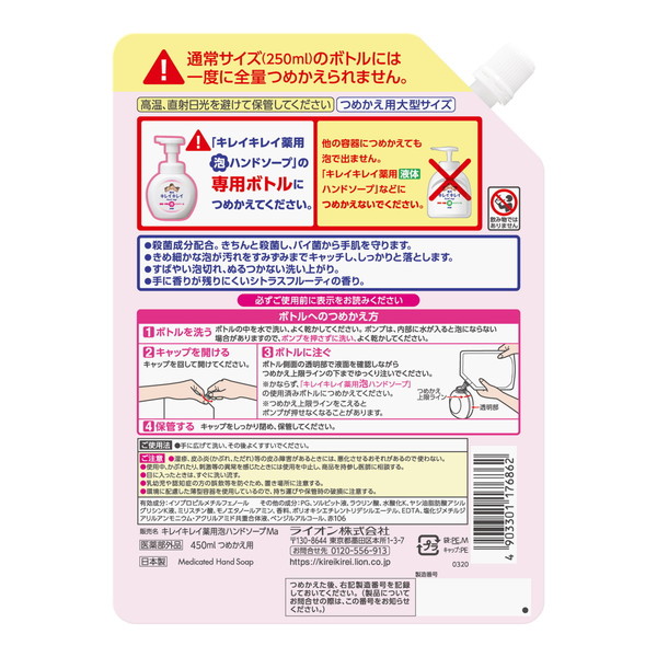 商品名:キレイキレイ 薬用泡ハンドソープ シトラスフルーティの香り つめかえ用 大型サイズ 450ml