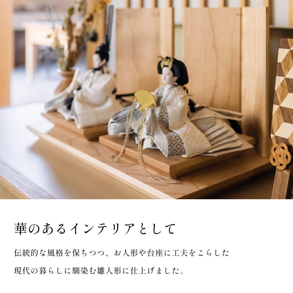 伝統的なお衣装で華やかで美しいお人形でありながら、シンプル・モダンなインテリアに馴染む、おしゃれな雛人形