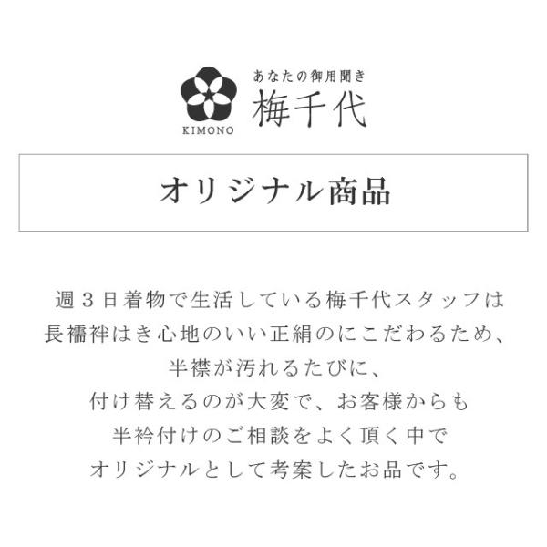 週3着物生活の梅千代スタッフは正絹の長襦袢にこだわるため、半衿が汚れるたびに衿の付け替えが面倒だと考案したお品です。