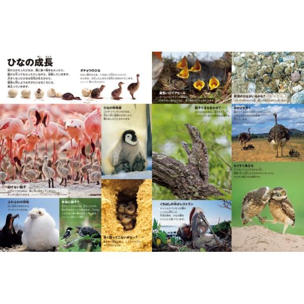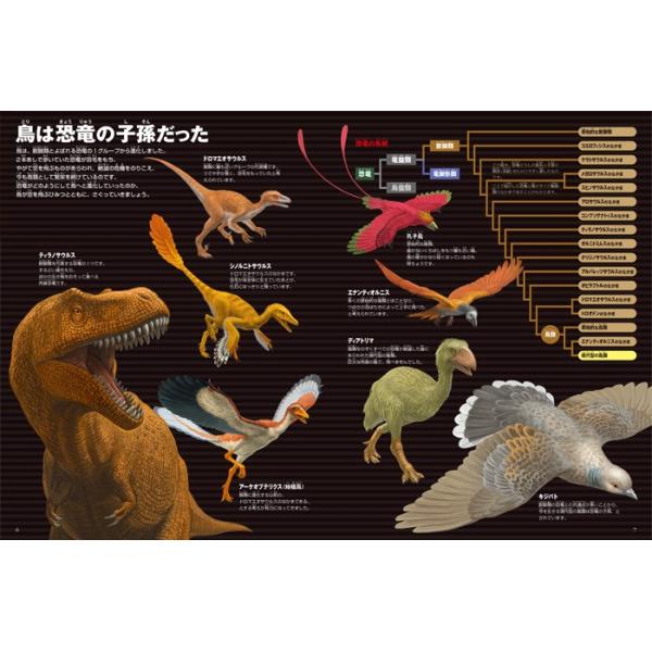 鳥の分類は、DNA分析によって大きく変わりました。本書では、子ども向け鳥類図鑑初の「最新DNA分析コラム」を導入。<ハヤブサはタカではなく、なんとインコやスズメに近かった!>、<空を飛べないペンギンの親戚は、ゆうゆうと空を飛ぶアホウドリだった!>といった、DNA分析ならではの新発見をわかりやすく解説しています。また「鳥って恐竜の生き残りなの?」、「なぜ鳥は空を飛べるの?」といった鳥類の2大テーマを中心に解説する巻頭特集20ページは必見です。羽毛恐竜の発見によって、<鳥は恐竜の子孫>であることが定説となりました。今を生きる鳥と羽毛恐竜との共通点をさぐりながら、恐竜がどうやって空へと進出し、鳥として現代に生き残ったのか、その秘密に迫ります。この特集を読んだ後は、身近にいるスズメやカラスを見る目がきっと変わるはずです。