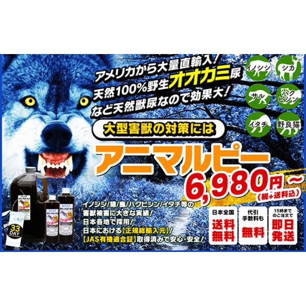 天然100%野生オオカミ(ウルフ)尿 害獣対策 熊イノシシ鹿ハクビシン猿タヌキ野良猫 ウルフピー同内容同品質品 アニマルピーNo.1 ガロンボトル(3.8リットル)