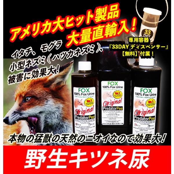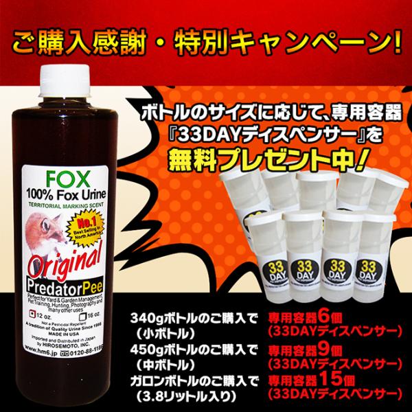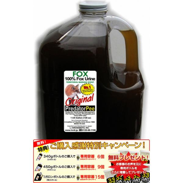 ◆今なら、「アニマルピーNo.2(天然100%野生キツネ尿=天然100%野生フォックス尿)ガロンボトル(3.8リットル入り)」を購入されたお客様に、専用容器【33DAYディスペンサー】15個も【無料プレゼント中】!◆