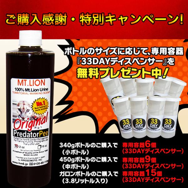 ◆今なら、「アニマルピーNo.5(天然100%野生 山ライオン尿=天然100%野生ピューマ尿)ガロンボトル(3.8リットル入り)」を購入されたお客様に、専用容器【33DAYディスペンサー】15個も【無料プレゼント中】!◆