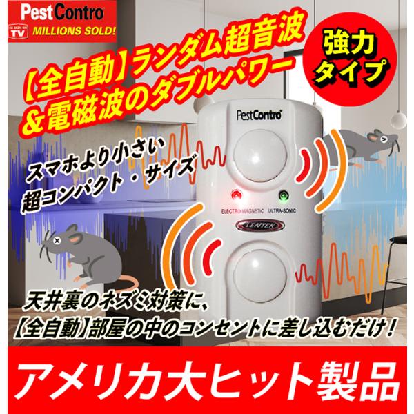 超コンパクトな機器を【コンセントに差し込むだけ】で、後は全て【全自動】で、(ランダム変動の)超音波&電磁波のダブルパワーで、ネズミ害虫を殺すことなくネズミ害虫の死骸を見ることもなく、ネズミ害虫を徐々にジワジワと追い詰める、アメリカ大ヒット技術の最新駆除方法!