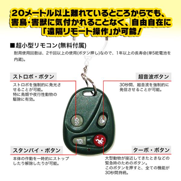【全自動の】(1)「ランダム超音波」+(2)「青色LED5灯ストロボ」+(3)「威嚇音(強弱の調整可能)」の3大機能が【コンパクト・サイズ】の一台に搭載!