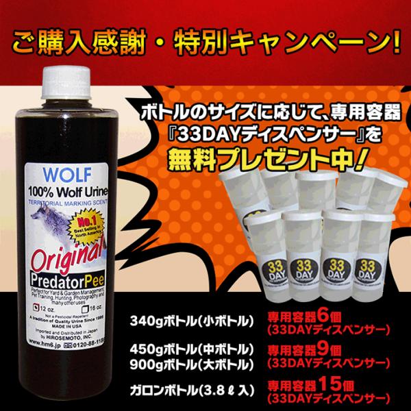 ◆今なら、アニマルピーNo.1(天然100%野生ウルフ尿=天然100%野生オオカミ狼尿)小ボトル(340g)(『ウルフピー』同内容・同品質品)を購入されたお客様に、専用容器【33DAYディスペンサー】を6個も【無料プレゼント中】!◆