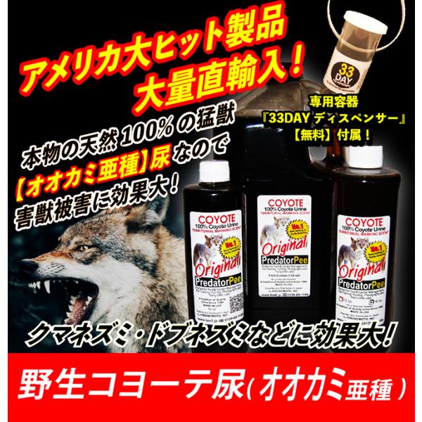 ◆今なら、「アニマルピーNo.4(天然100%野生コヨーテ尿=オオカミの亜種)小ボトル(340g)」を購入されたお客様に、専用容器【33DAYディスペンサー】6個も【無料プレゼント中】!◆