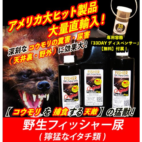 ◆今なら、「アニマルピーNo.6(天然100%野生フィッシャー尿=最も獰猛・凶暴な【コウモリの天敵】イタチ類)小ボトル(340g)」を購入されたお客様に、専用容器【33DAYディスペンサー】6個も【無料プレゼント中】!