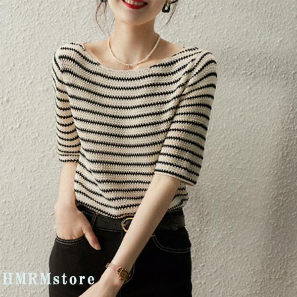 ニット レディース セーター 半袖 5分袖 サマーニット ボーダー コットン 綿 夏 クルーネック きれいめ おしゃれ