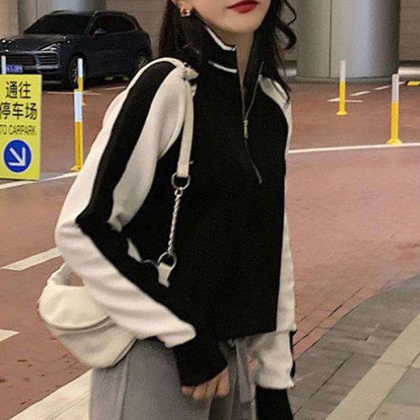 スエット レディース トップス 長袖 ハーフジップ カットソー トレーナー 配色 ショート丈 クロップド 短め かわいい