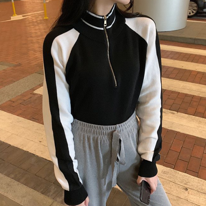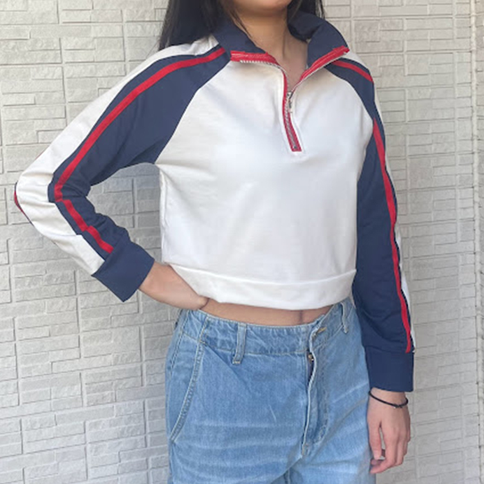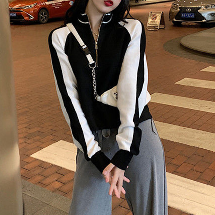 スエット レディース トップス 長袖 ハーフジップ カットソー トレーナー 配色 ショート丈 クロップド 短め かわいい