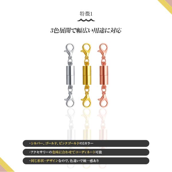 今回のカラーバリエーションには「シルバー」「ゴールド」「ピンクゴールド」の3色をご用意し、合計5個入りセットで様々なアクセサリーにご利用いただけま
