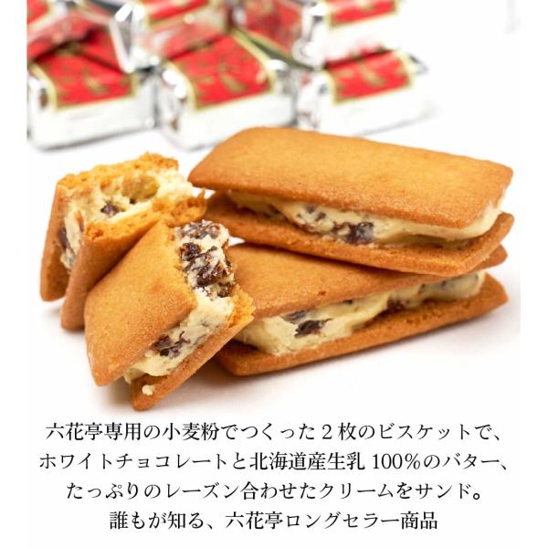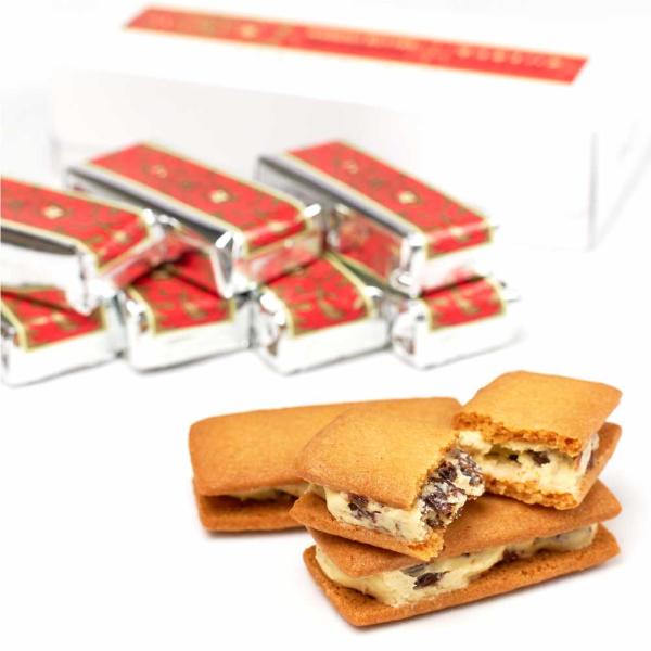 専用の小麦粉でつくったビスケットで、ホワイトチョコレートとレーズン、北海道産生乳100%のバターをあわせたクリームをサンドした、ロングセラー商品です。