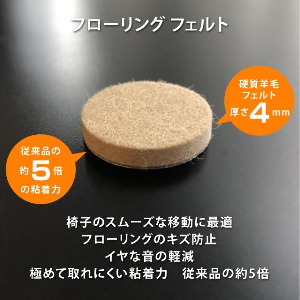 快適なすべりやすさはそのままに、フェルト厚は4mm(従来品の2倍)、椅子の脚への粘着力を従来品の5倍に改良。フローリングの傷防止、嫌な音の軽減の決定版です。かねてからお客様よりいただいておりました「椅子の脚からフェルトが外れる」などのお悩みを解消致します。