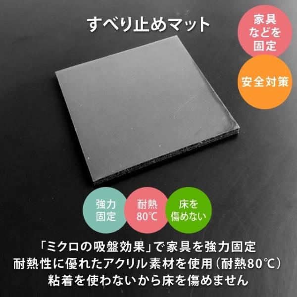 ソファのすべり止めに! 一枚板テーブルの板と脚の固定に頻繁に使われています。マットの中のミクロの気泡が、圧をかけることにより強力な吸盤になります。熱に強く(耐熱80℃)外す時は簡単に取り外せます。ソファーの滑り止めや、ベッドの固定等に最適です。フローリングに跡残りしにくく、水で拭くと更によく取れます。テレビの下や家具の下に敷き、乗せるだけで吸盤のように吸いつくイメージです。接着粘着ではありません。地震対策としても効果大です。