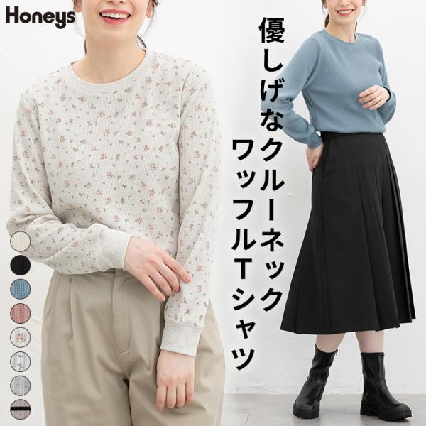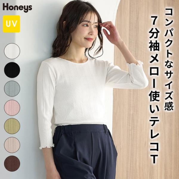 トップス Tシャツ 7分袖Tシャツ カットソー UVカット メロー 綿100% ランダムテレコ素材 レディース Honeys ハニーズ 7分袖メロー使いテレコT