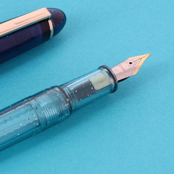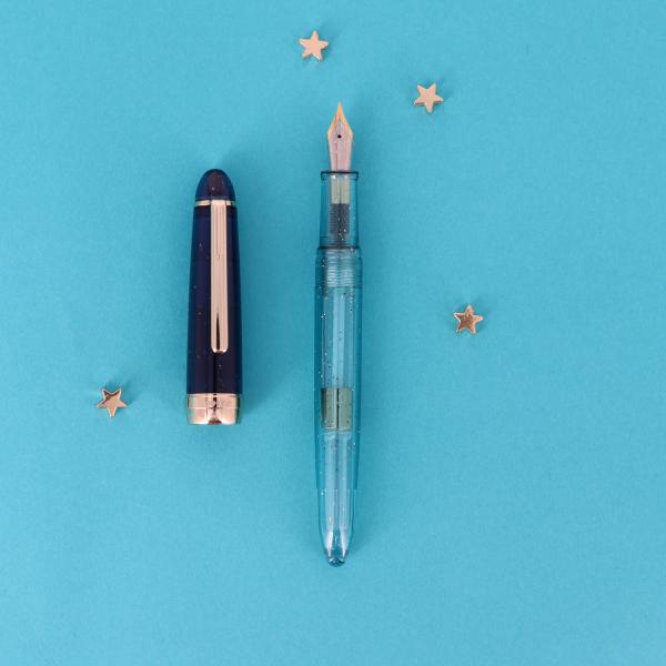 季節や時間ごとに移ろう空をイメージした万年筆。空に瞬く星々をイメージしたラメ入りのボディ。軸とキャップで微妙に異なる色合いは空の柔らかなグラデーションを表現。定番のF字ペン先に加え、付け替え可能なM字ペン先も付いたセット。M字のペン先は定番のF字よりも少し太めの文字が書け、インクをしっかり使った書き味に。インクの濃淡が出やすく、万年筆ならではのインクの表情を楽しめる。文字を書くだけではなく、アートな場面など、多彩な用途で活躍。