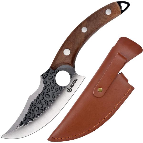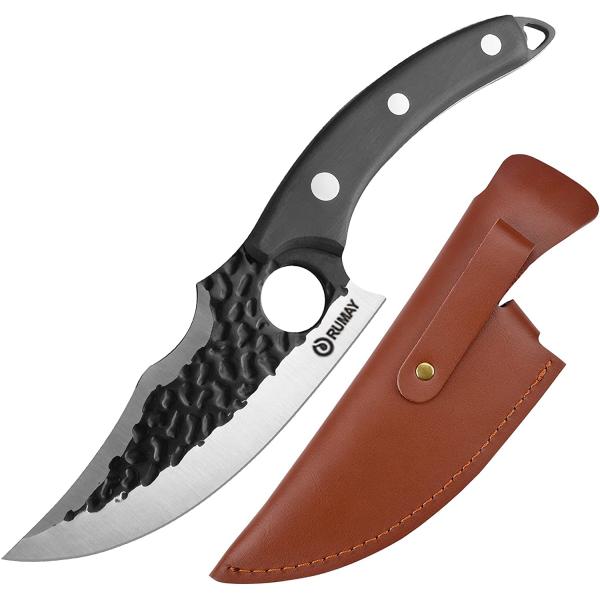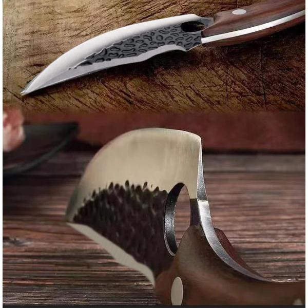 2.(多目的) 特別設計した円状の刃部は豚、鶏、鳥の骨のスキ、魚の捌きなどを簡単に扱えます。キャンプ用、釣り用、狩猟解体包丁としても幅広く使えます。本革の収納袋付き、アウトドアでも欠かせない実用的なナイフです。