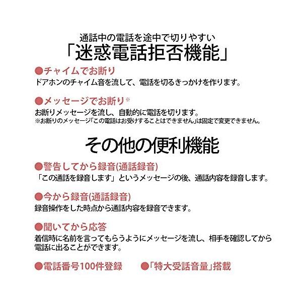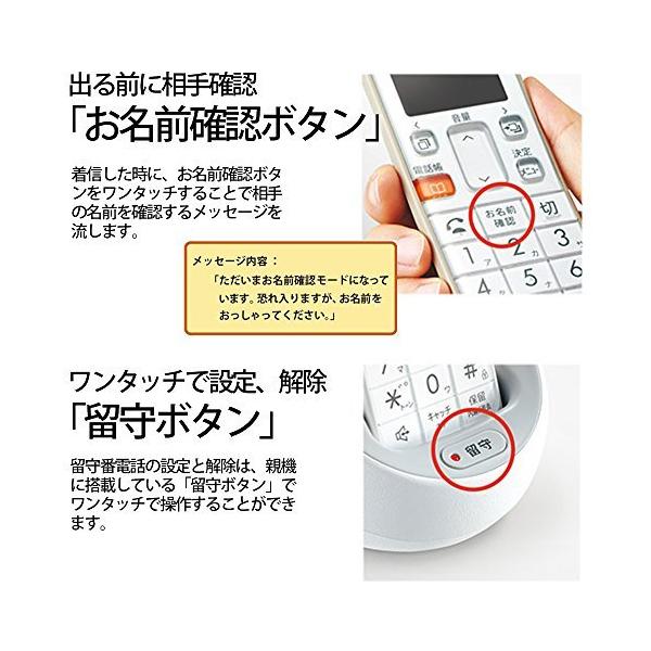 「商品情報」コンパクトで使いやすいラウンドデザイン・着信した時に、「お名前確認ボタン」をワンタッチすることで相手の名前を確認するメッセージを流します。・留守番電話の設定と解除は、親機に搭載している「留守ボタン」でワンタッチで操作することができます。・「この通話を録音します」というメッセージで相手をけん制しながら通話内容を録音できる「警告してから録音」。・通話中の電話を途中で切りやすい「迷惑電話拒否機能」・今から録音(通話録音)録音操作をした時点から通話内容を録音できます。・よくかける相手の名前(カタカナ)と電話番号を100件登録できます。・通話中、相手の声が聞こえにくい時に聞き取りやすくできる「特大受話音量」搭載・外出先の電話から留守録を聞ける「外線リモート」対応・用件の頭出しがすばやくできる「デジタル留守録」対応◆別売子機を3台増設可能(増設子機型番:JD-KS120)「主な仕様」■親機:幅 92×奥行 92×高さ 71(mm) 重量 約 128g