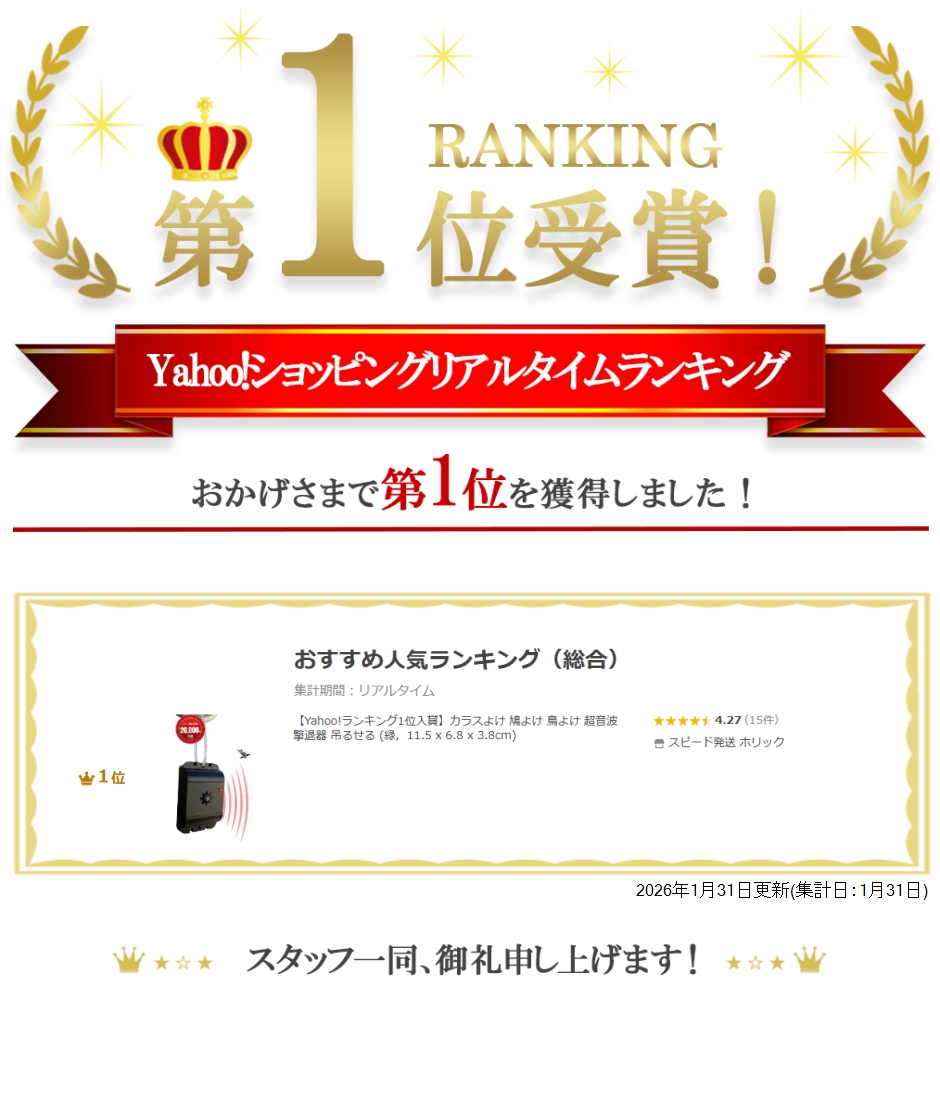 ・鳥の好まない周波数の超音波を出すので、鳥が習慣的に来るような場所においておくことで、鳩やカラスなどの鳥よけの効果があります。