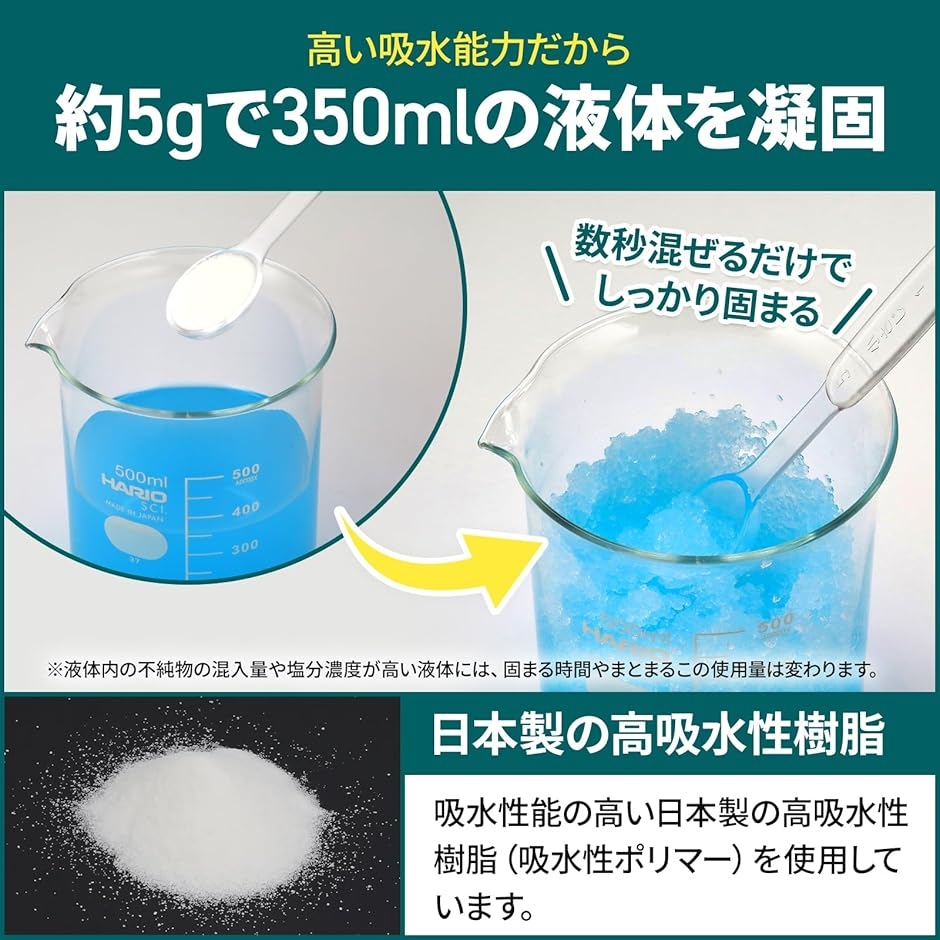 「環境にも優しい高吸水性樹脂」約5gで液体350mlを固めます。