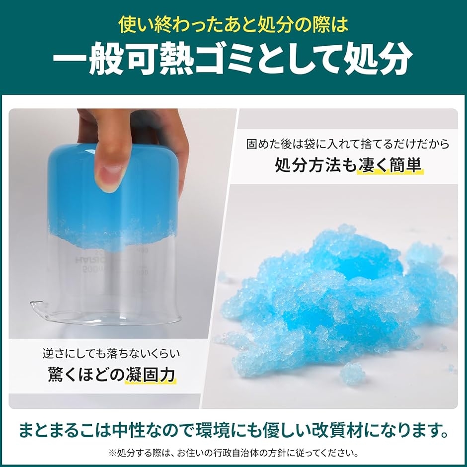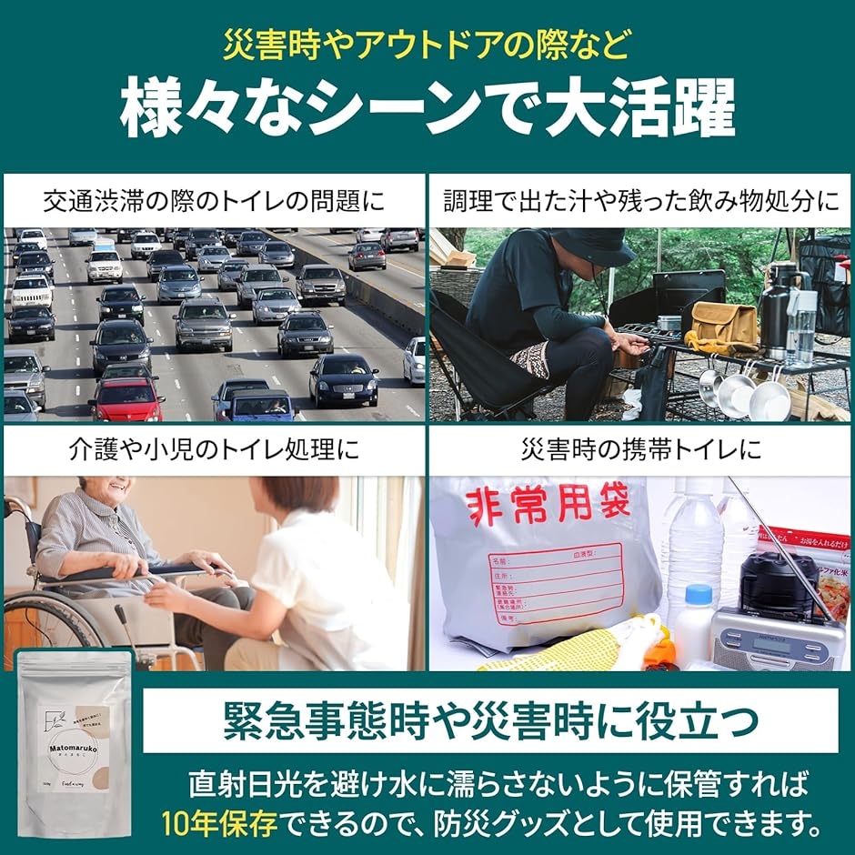 「利用シーンは多方面で」・普段のキッチン周りや食後の残り汁の処分に ・災害時や高速道路等での交通渋滞時のための携帯トイレに ・吸水後に冷凍してアウトドアの保冷剤として利用に ・大雨や水災などによる浸水被災時の泥土吐き出し ・清掃時に使用に ・大雨後の水溜まりに撒くだけで改質に ・芳香剤作成や園芸用土の保水材料として ・模型作成時塗装時に使った余った不要塗料、シンナーやツールクリーナー液の処理に