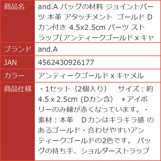 バッグの材料 ジョイントパーツ 本革 アタッチメント ゴールド Dカン付き 4.5x2.5cm( アンティークゴールドxキャメル)
