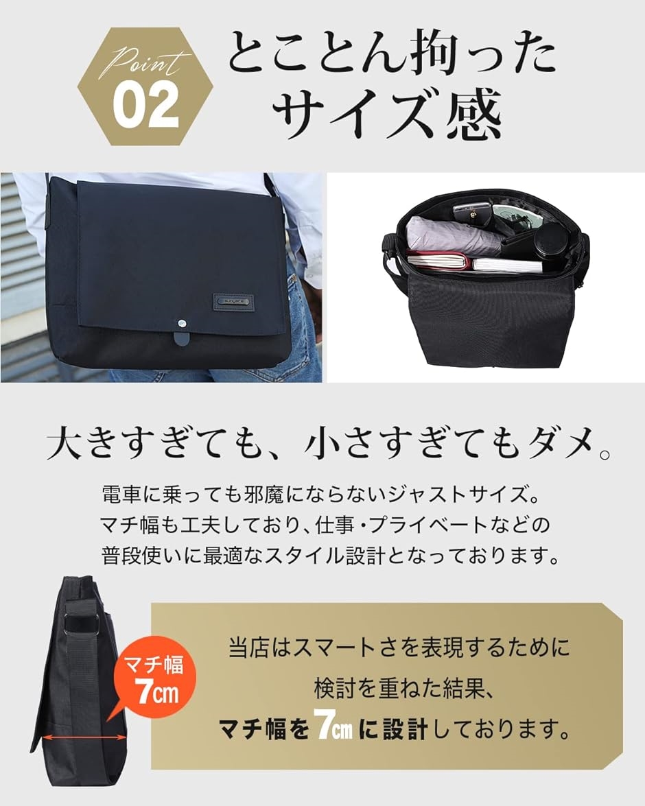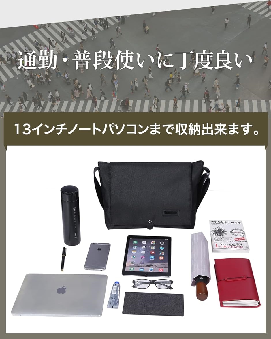 ・ななめ掛けのメッセンジャーバッグとして使えるため、両手がふさがらず便利です。