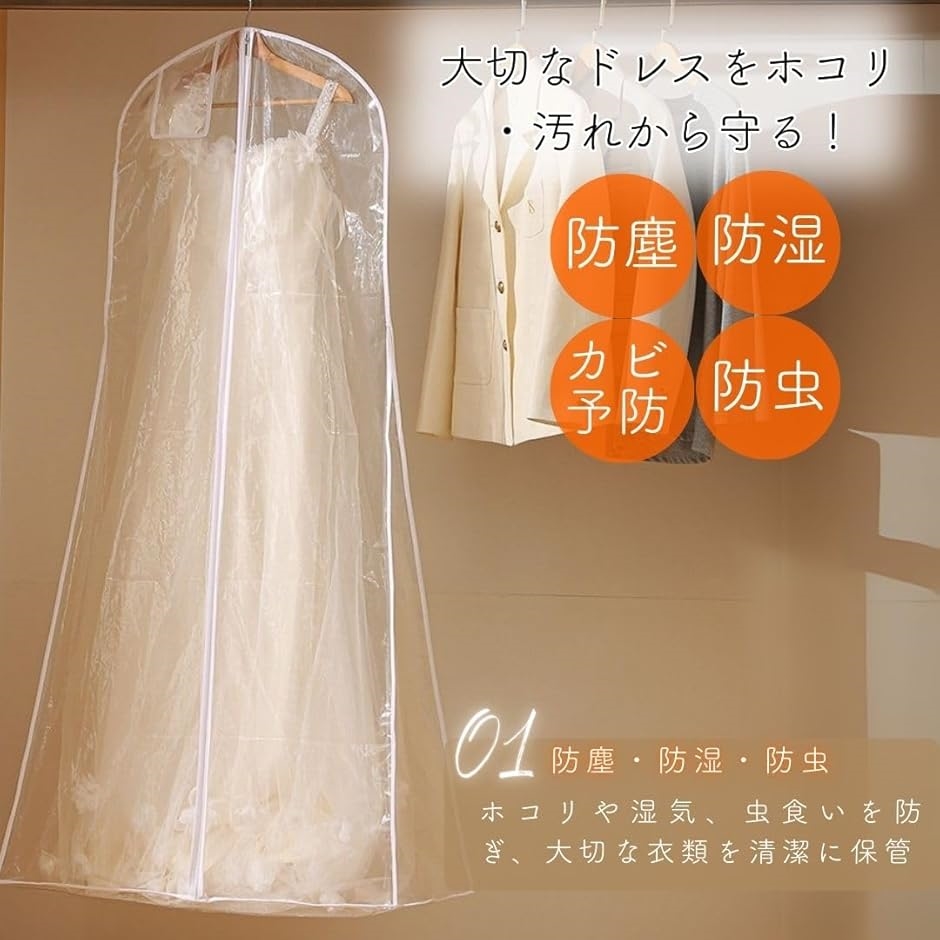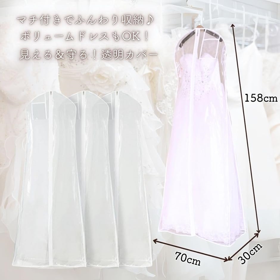 マチ付き ドレスカバー ロング 透明 3枚セット 洋服カバー ウェディング 社交ダンス 衣装カバー 160cm(透明)