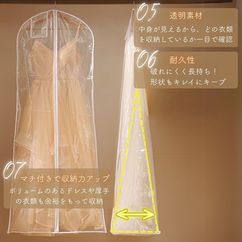 ボリュームのあるウエディングドレスや社交ダンスのドレスも収納できるマチ付きのドレスカバーです。