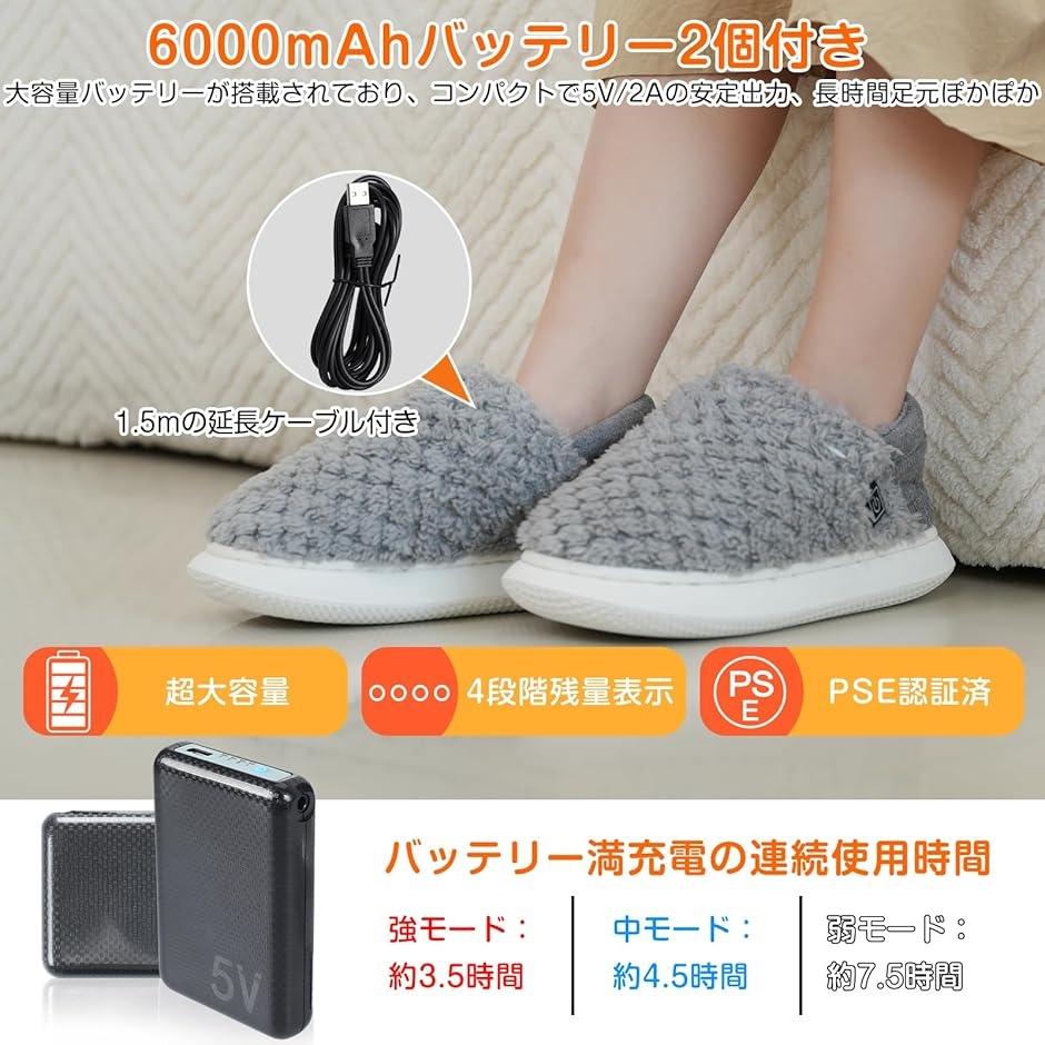 「大容量6000mAhバッテリー2個付き」2024新版フットウォーマーはDC 5V/2.1A安定出力の6000mAhバッテリーが2個付属しており、高温モードで約3.5時間、中温モードで約5時間、低温モードで約7.5時間の連続使用が可能です。