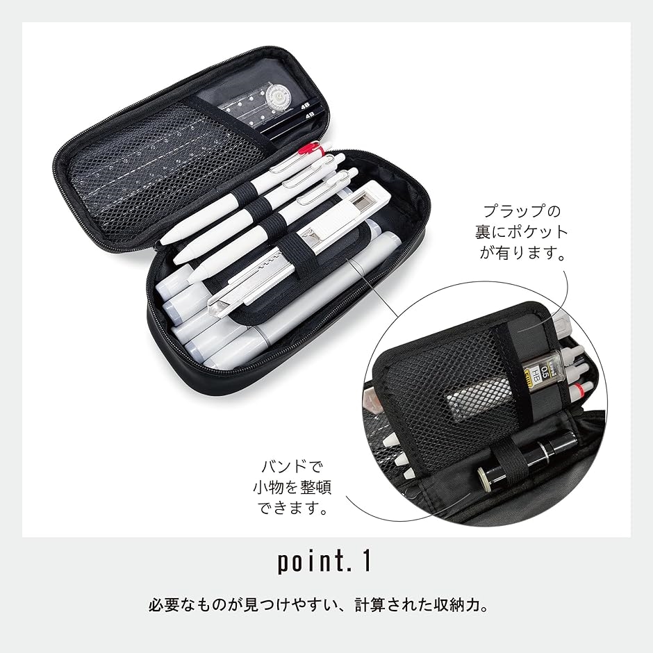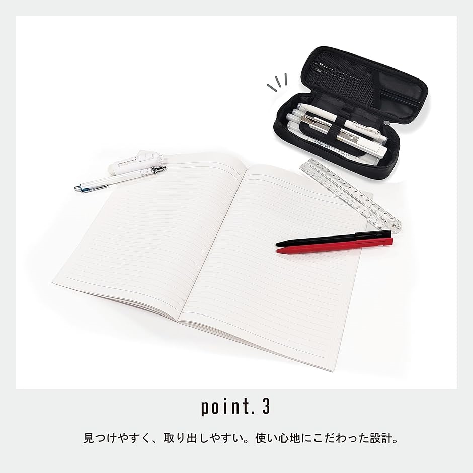 日常的に持ち運びやすいサイズながら、ボールペン、シャープペン、蛍光ペン、定規、はさみ、ふせんなど、日常的に必要なアイテムをしっかり収納可能です。