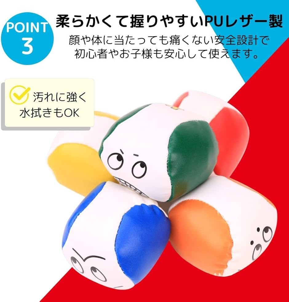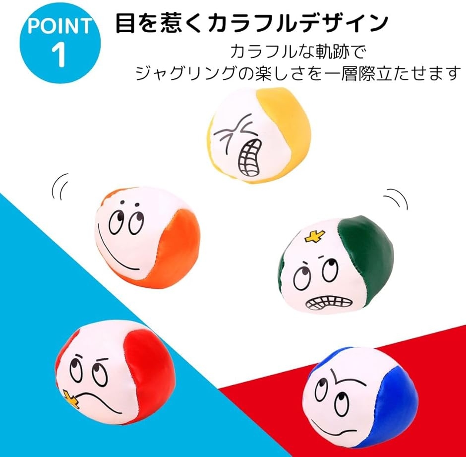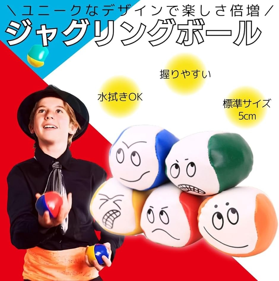 「ユニークなデザインで楽しさ倍増」5種類のユニークな表情が描かれたカラフルなジャグリングボールセット。