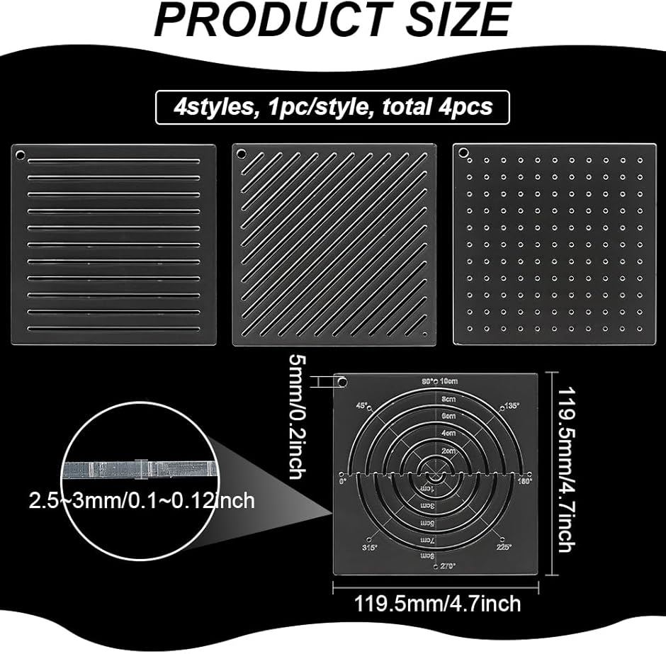 サイズ詳細: ステンシルのサイズは約幅119.5mmx長さ119.5mmx厚さ2.5〜3mm、穴:5mm、4個/セット。