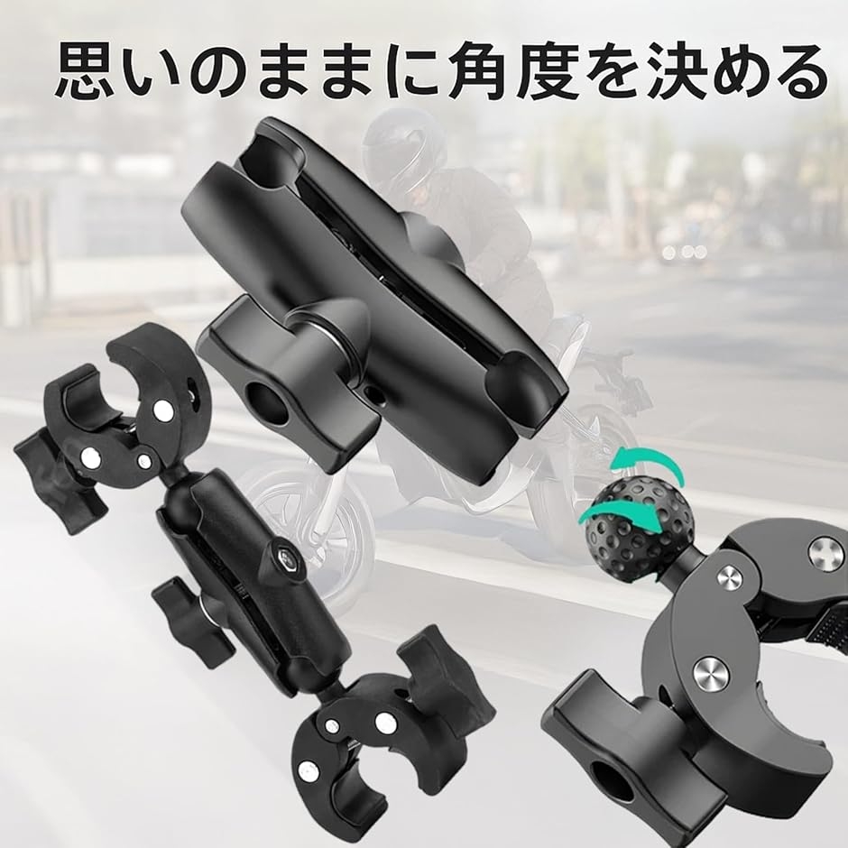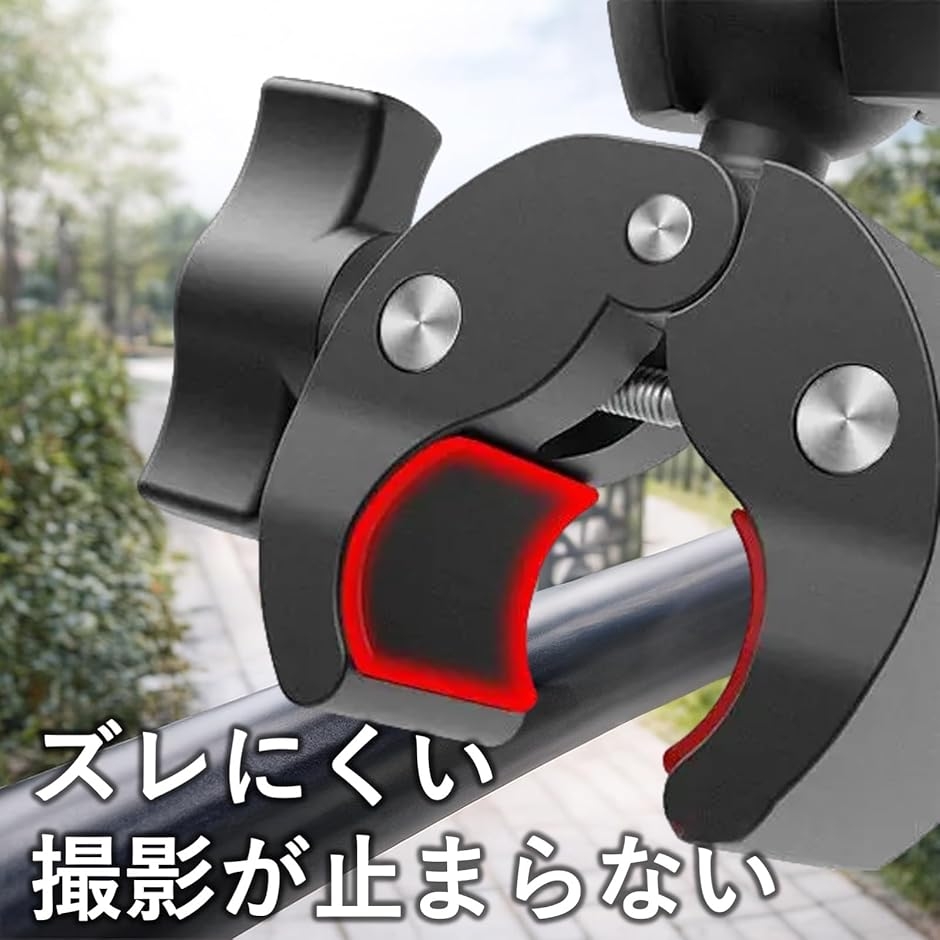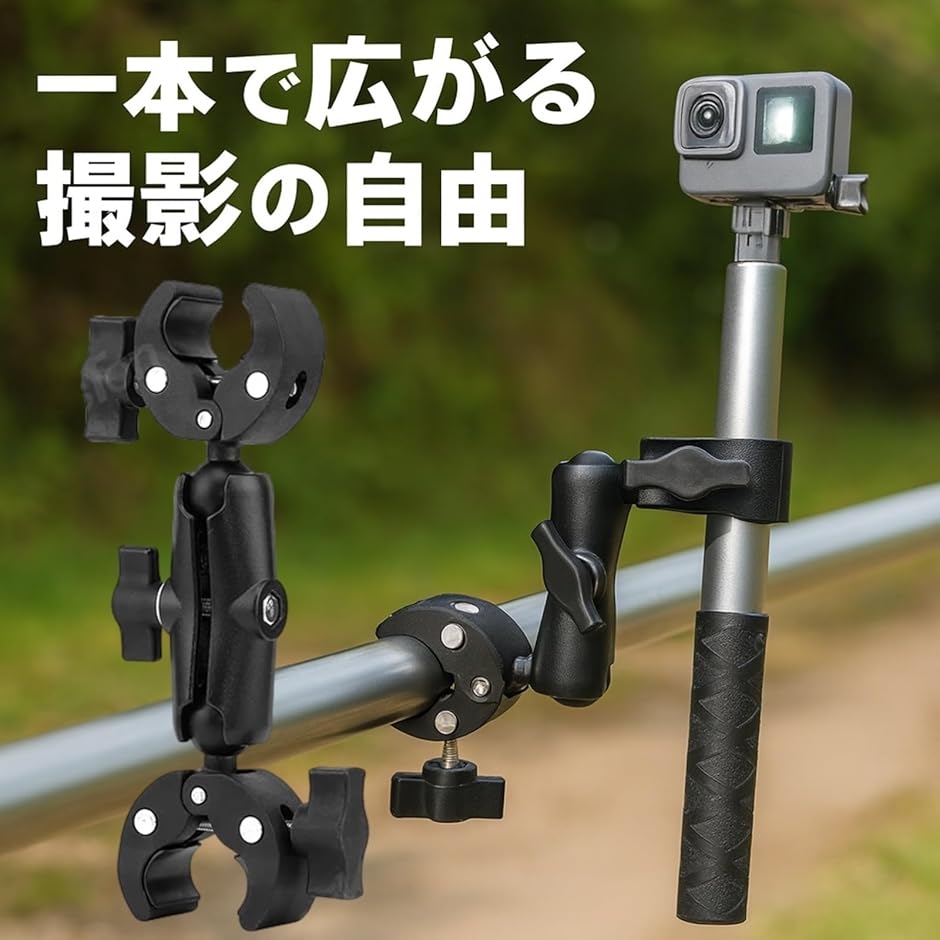 ボールヘッドアームが上下・左右・前後へ自在に回転し、アクションカメラ・スマホホルダー・LEDライトなどの角度調整がスムーズで、自転車撮影やバイク撮影、配信スタンドとしても扱いやすいカメラマウントです。