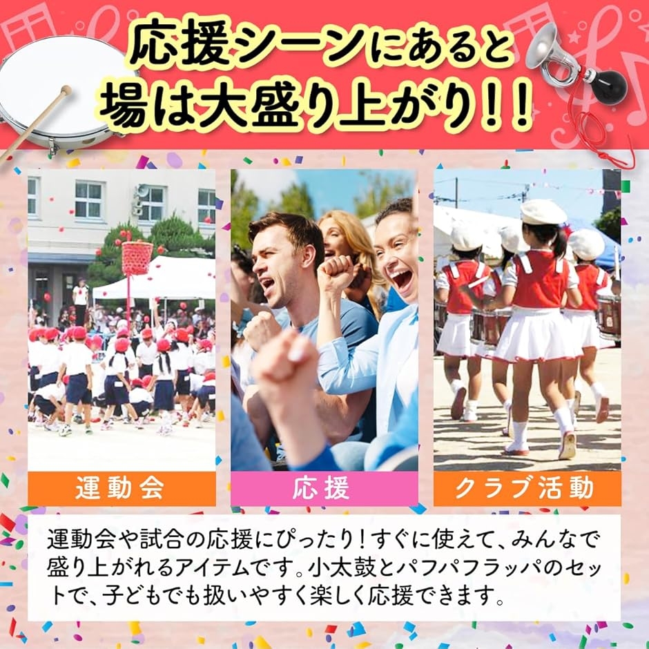 「イベントを盛り上げる。小太鼓&パフパフラッパセット」 子どもから大人まで楽しめる、運動会や応援イベントの必需品。4種類のサイズ展開のある小太鼓とパフパフラッパがセットになった、手軽に使えて盛り上がる応援グッズです。