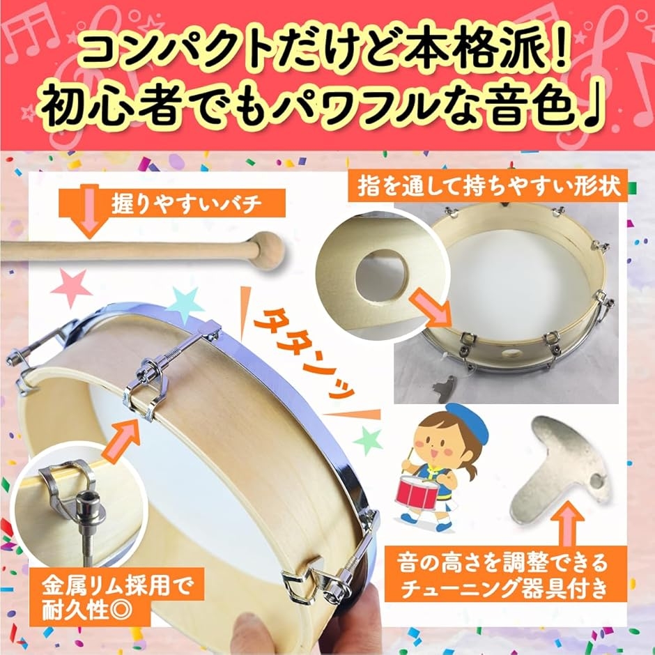「明瞭で存在感のあるサウンド」 小型ながらも本格的な響きを持つ小太鼓は、軽く叩くだけで明瞭な音色を響かせます。