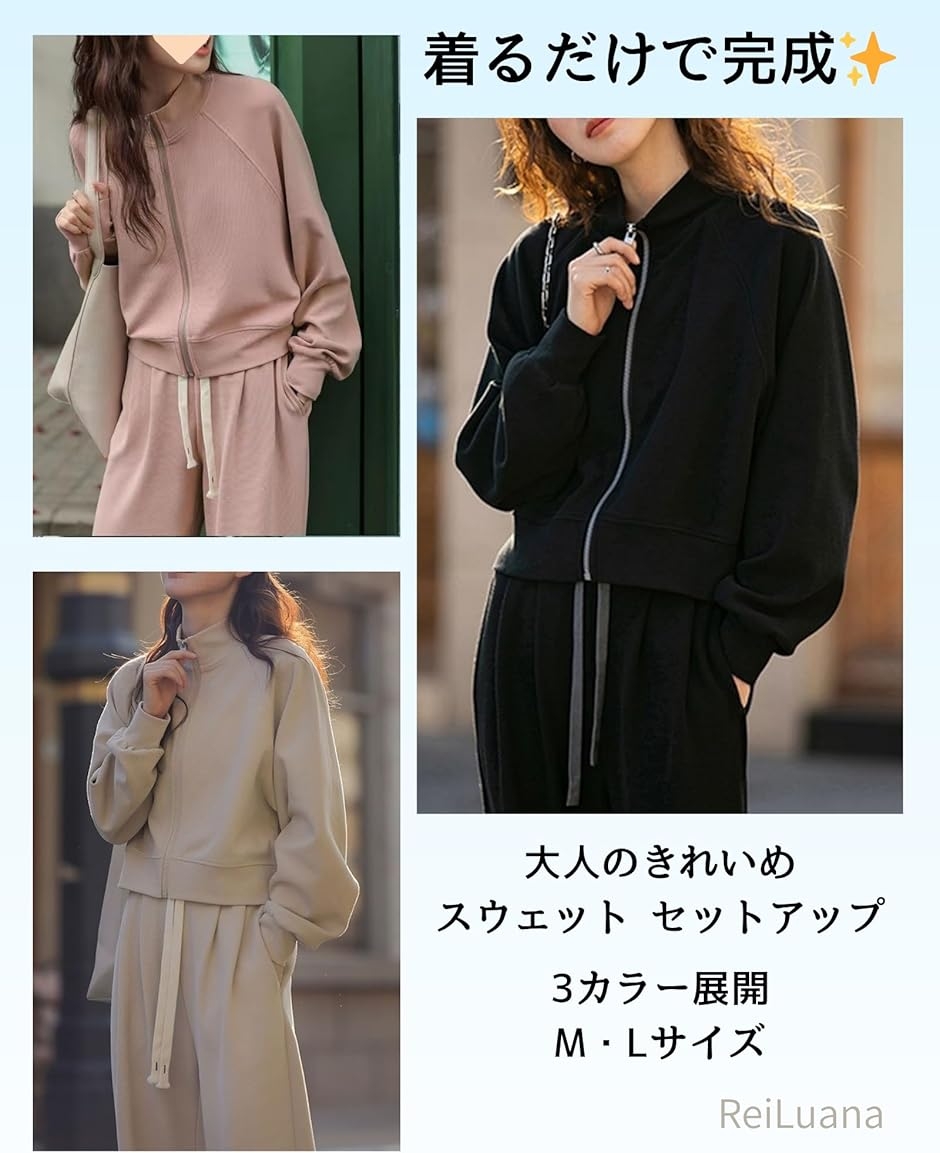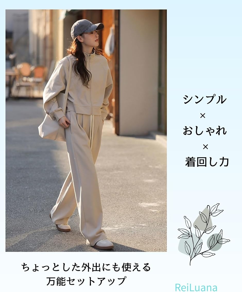 ワイドシルエットで脚長効果も〇 「ジャージ 上下 レディース」「スウェット セットアップ」「ゆったり シルエット」を意識したおしゃれなカジュアルスタイルです。