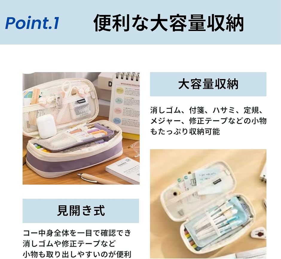 また、見開き式になるため、中身全体を一目で確認でき、消しゴムや修正テープなどの小さい小物も取り出しやすいのが便利です。