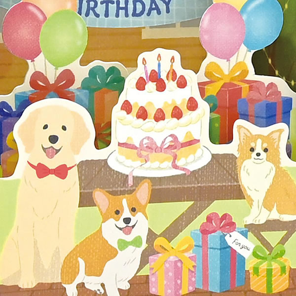 犬たちがガーデンパーティーを開いて誕生日をお祝いしてくれるデザインです。