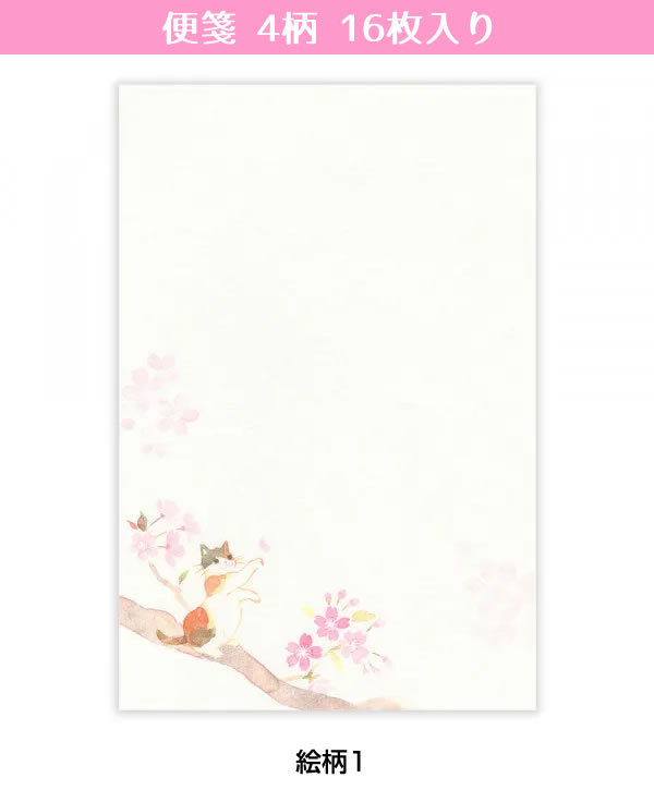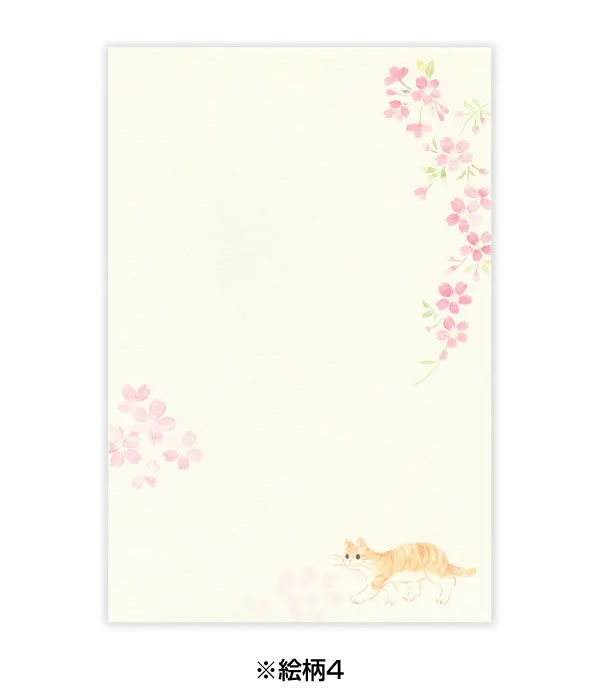お花見を楽しむ猫たちを描いたA5サイズのセット。4種類の便箋デザインがあり、送る相手に合わせて選ぶ楽しみも。奉書紙のしっかりとした質感が、心のこもった便りを演出します。