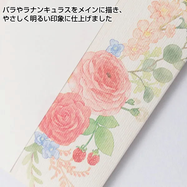 バラやラナンキュラスをメインに描き、やさしく明るい印象に仕上げました。