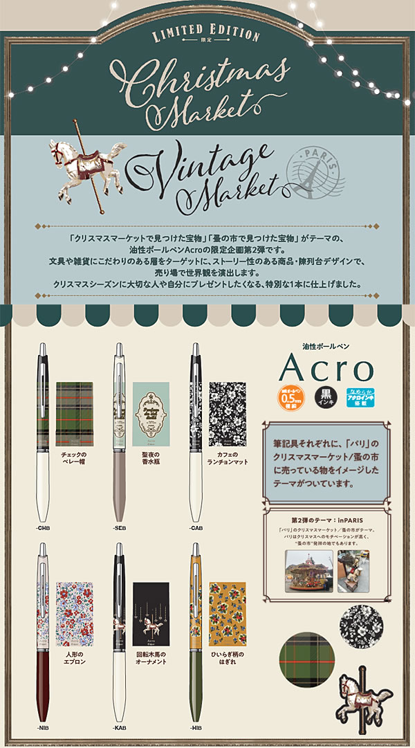 「クリスマスマーケットで見つけた宝物」「 蚤の市で見つけた宝物」 がテーマの、油性ボールペンAcroの限定企画第2弾です。